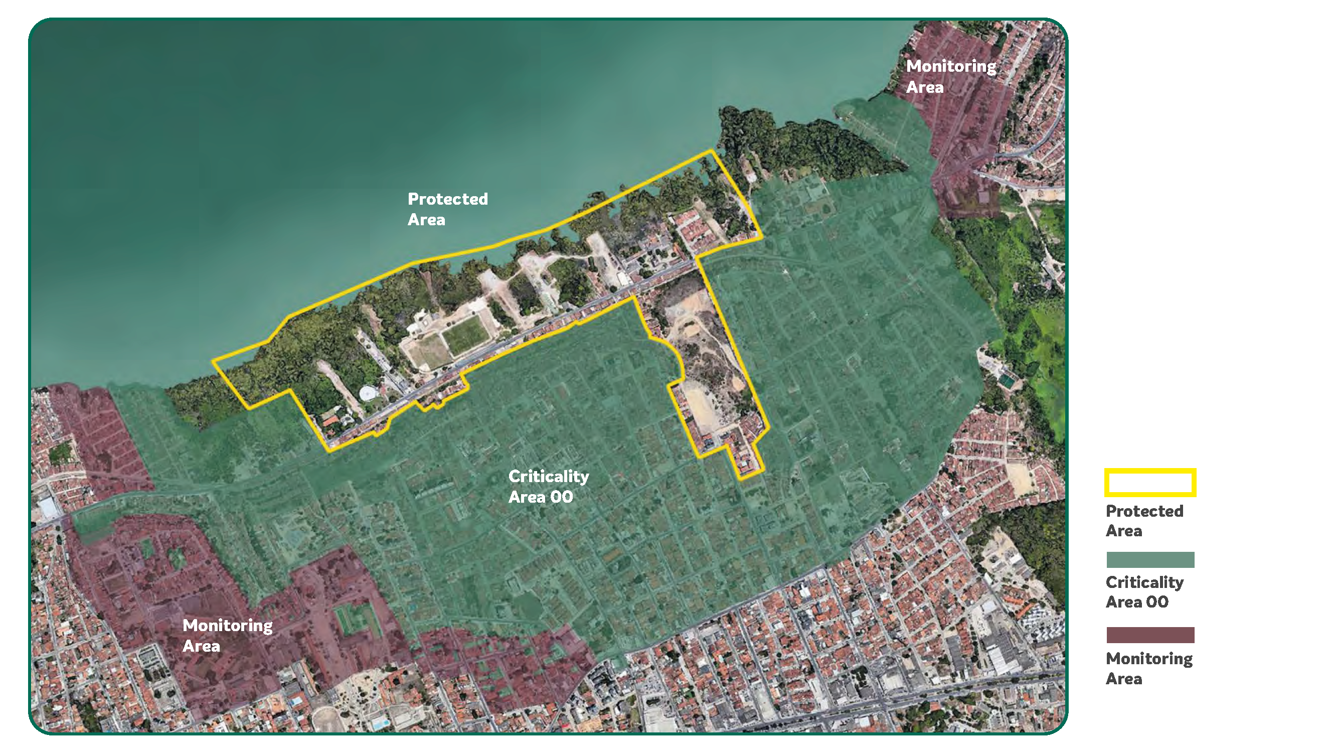 to this protected area , encompassing about 550 properties, a broader vacant area was added based on the Civil Defense's Map of Priority Action Lines and its updates, covering parts of the neighborhoods of Mutange, Pinheiro, Bebedouro, Bom Parto, and Farol.